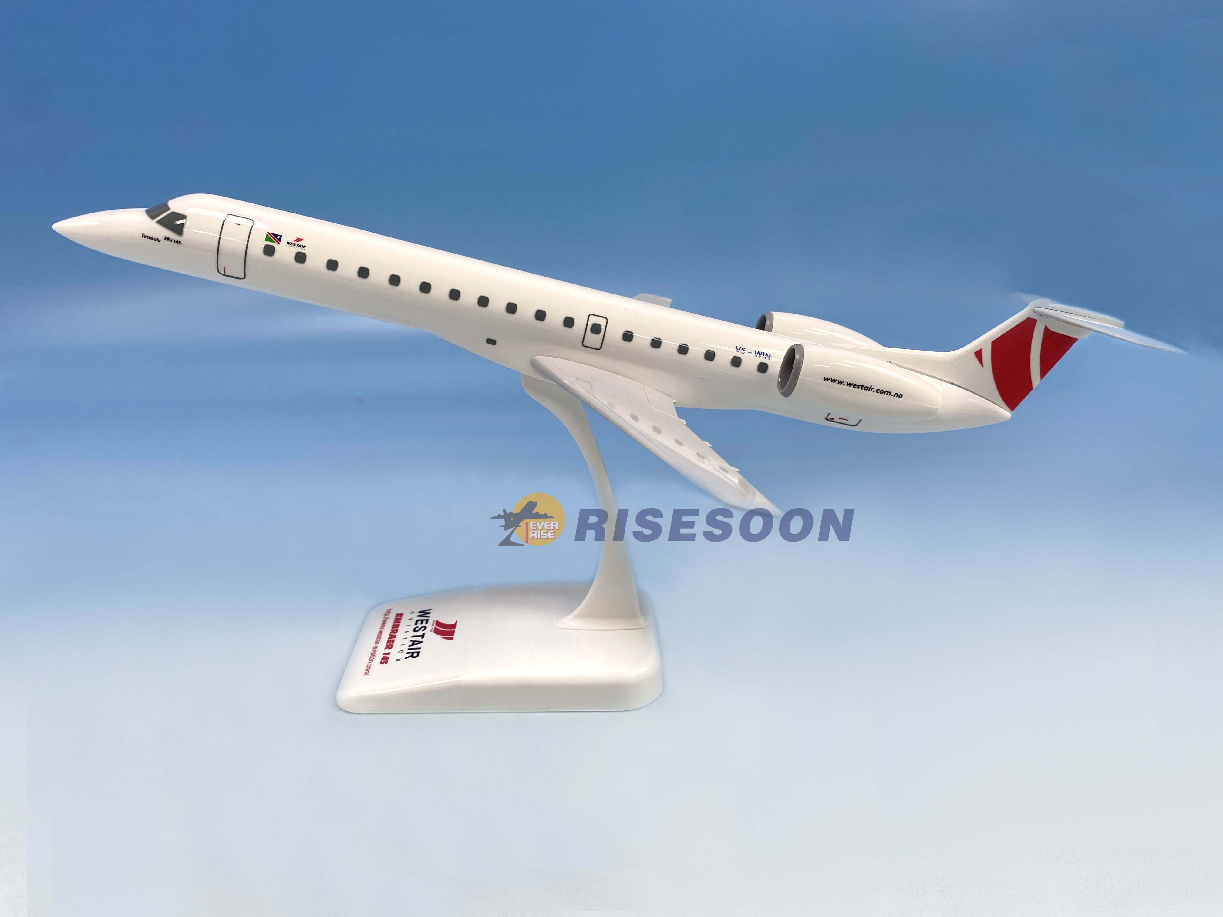 航空公司:西斯泰航空 / Westair Aviation 机 型:EMB-145 注册号码:V5-WIN 材 质:ABS实心 尺寸 ( 长x宽 ):305 x 220 mm 比 例:1/100 零 组 件:无机轮+一般引擎+塑座